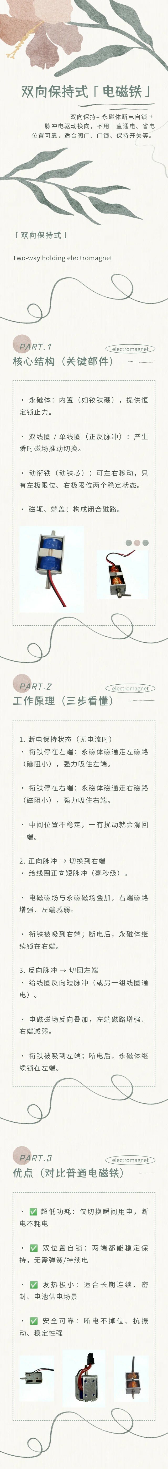 核心特点:通电切换状态、断电永久保持,无需持续供电,双向双稳态(两端都能锁死)。