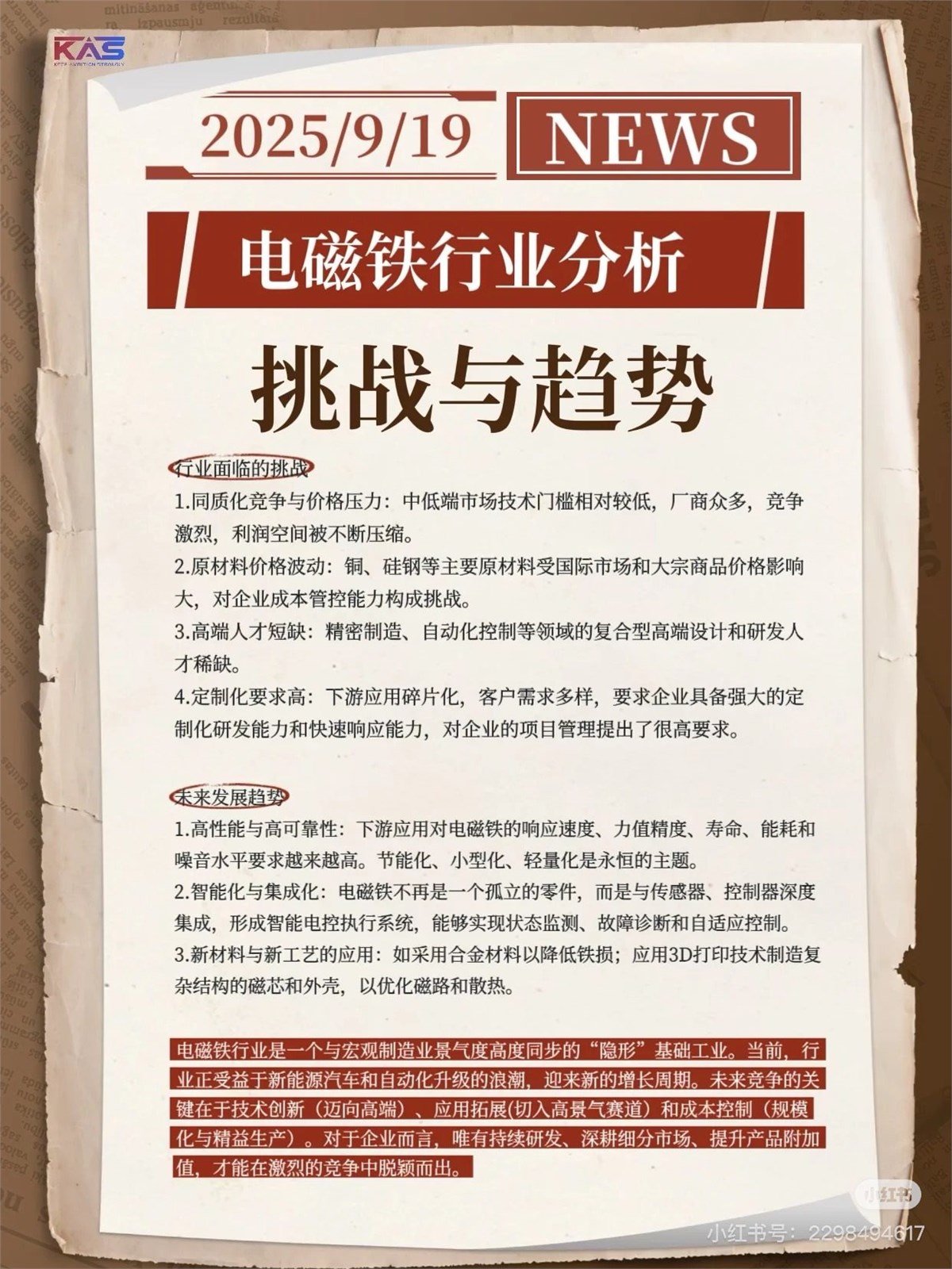 电磁铁行业是一个与宏观制造业景气度高度同步的“隐形”基础工业。当前,行业正受益于新能源汽车和自动化升级的浪潮,迎来新的增长周期。未来竞争的关键在于技术创新(迈向高端)、应用拓展(切入高景气赛道)和成本控制(规模化与精益生产)。对于企业而言,唯有持续研发、深耕细分市场、提升产品附加值,才能在激烈的竞争中脱颖而出。