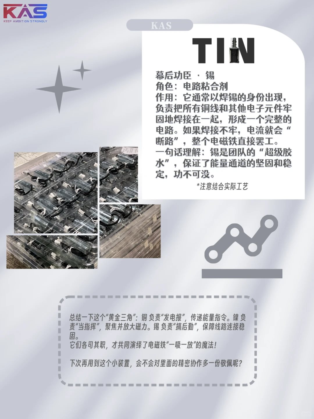 总结一下这个“黄金三角”:铜 负责“发电报”,传递能量指令。镍 负责“当指挥”,聚焦并放大磁力。锡 负责“搞后勤”,保障线路连接稳古。它们各司其职,才共同演绎了电磁铁“一吸一放"的魔法!下次再用到这个小装置,会不会对里面的精密协作多一份敬佩呢?