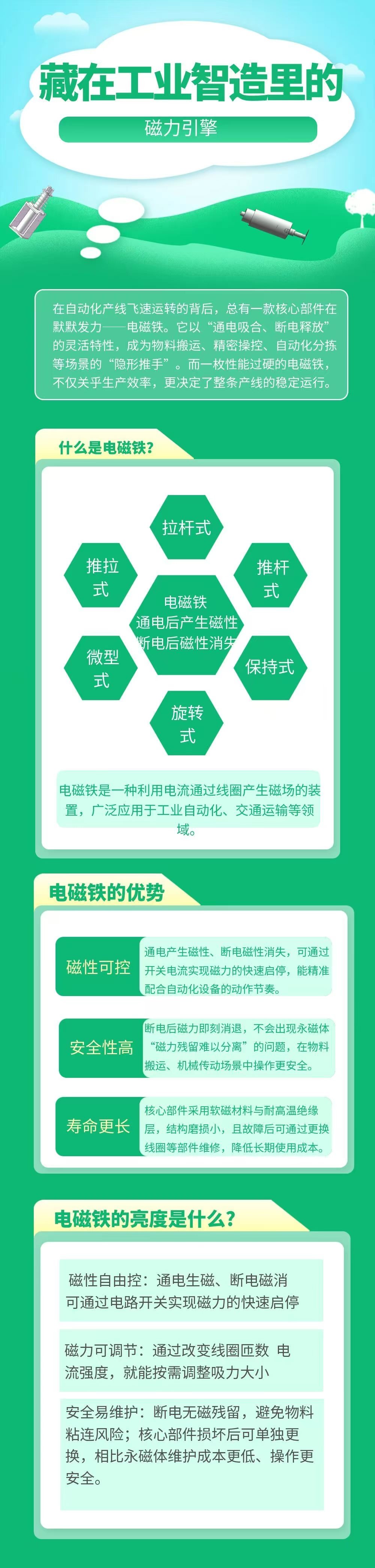 在自动化产线飞速运转的背后,总有一款核心部件在默默发力电磁铁。它以"通电吸合、断电释放"的灵活特性,成为物料搬运、精密操控、自动化分拣等场景的"隐形推手"。而一枚性能过硬的电磁铁,不仅关乎生产效率,更决定了整条产线的稳定运行。